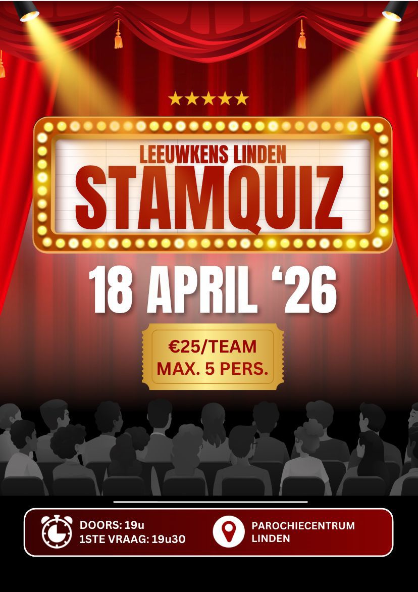 Op zaterdag 10 mei om 19u is het weer verzamelen geblazen voor de zevende editie van onze Stamquiz. Maak je klaar om je kennis te testen op een nieuwe locatie, namelijk het Ontmoetingscentrum Linden, Korenbloemstraat 12, 3210 Linden.