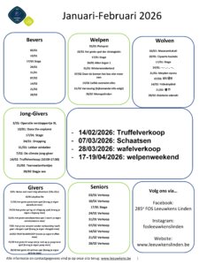 Programma Iedereen heeft elke zaterdag scouts tussen 14u en 17u, met uitzondering van sommige activiteiten. Veel plezier! PDF: Programma-januari-februari-2026