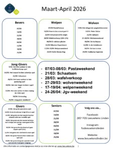Programma Iedereen heeft elke zaterdag scouts tussen 14u en 17u, met uitzondering van sommige activiteiten. Veel plezier! PDF: Programma-maart-april-2026